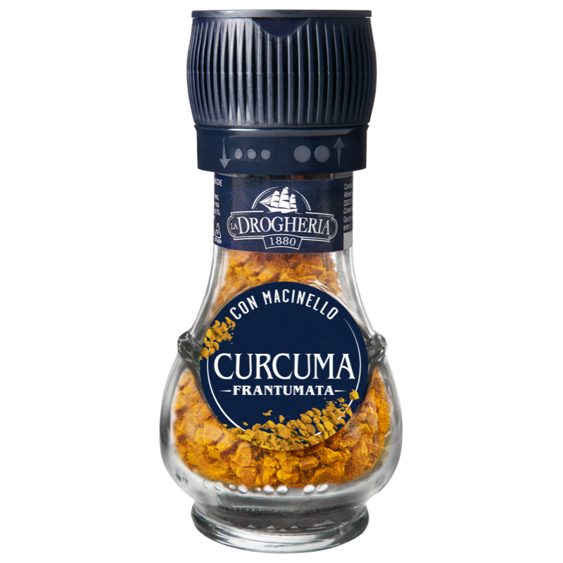 La Curcuma ha un gusto amarognolo e muschiato, leggermente pungente. La consistenza frantumata permette di conservare al meglio le proprietà organolettiche e il macinello permette di macinarla facilmente per ottenere la grana desiderata ed utilizzarla a crudo. È perfetta in abbinamento con carni grasse come il bollito, pesci come cozze e calamari, maionese e formaggi freschi.