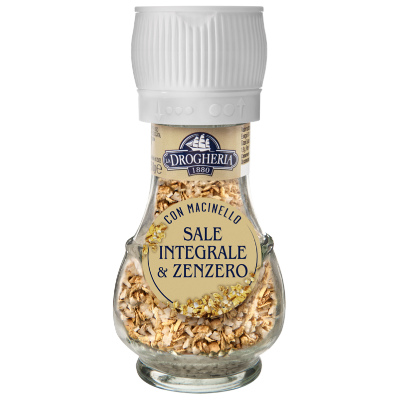 Il Sale Marino Integrale, ottenuto senza metodi di raffinazione chimica, incontra il gusto rinfrescante, pungente e leggermente piccante dello Zenzero. Rispetto al tradizionale sale da cucina, il Sale Marino Integrale vanta minori concentrazioni di cloruro di sodio e contiene una maggiore quantità di microelementi.